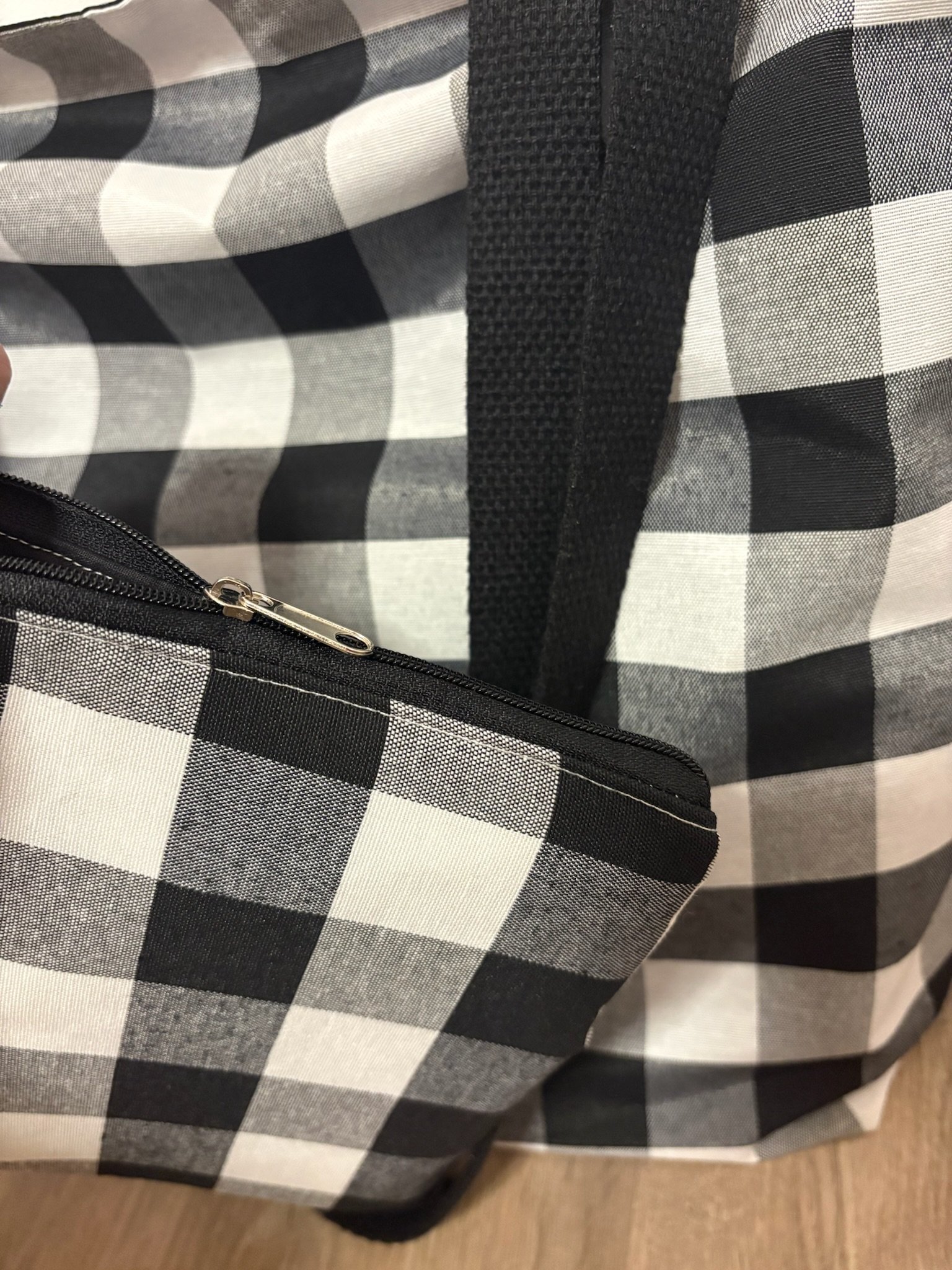 Pero eso no es todo. Para una organización impecable, hemos incluido un neceser plano a juego. Este práctico accesorio, también con estampado de cuadros blanco y negro y cierre de cremallera, es perfecto para guardar tus objetos más pequeños y mantenerlos siempre a mano. Desde tu teléfono móvil y cartera hasta tus cosméticos o artículos de papelería, el neceser te ayuda a mantener el orden dentro de tu totebag.
