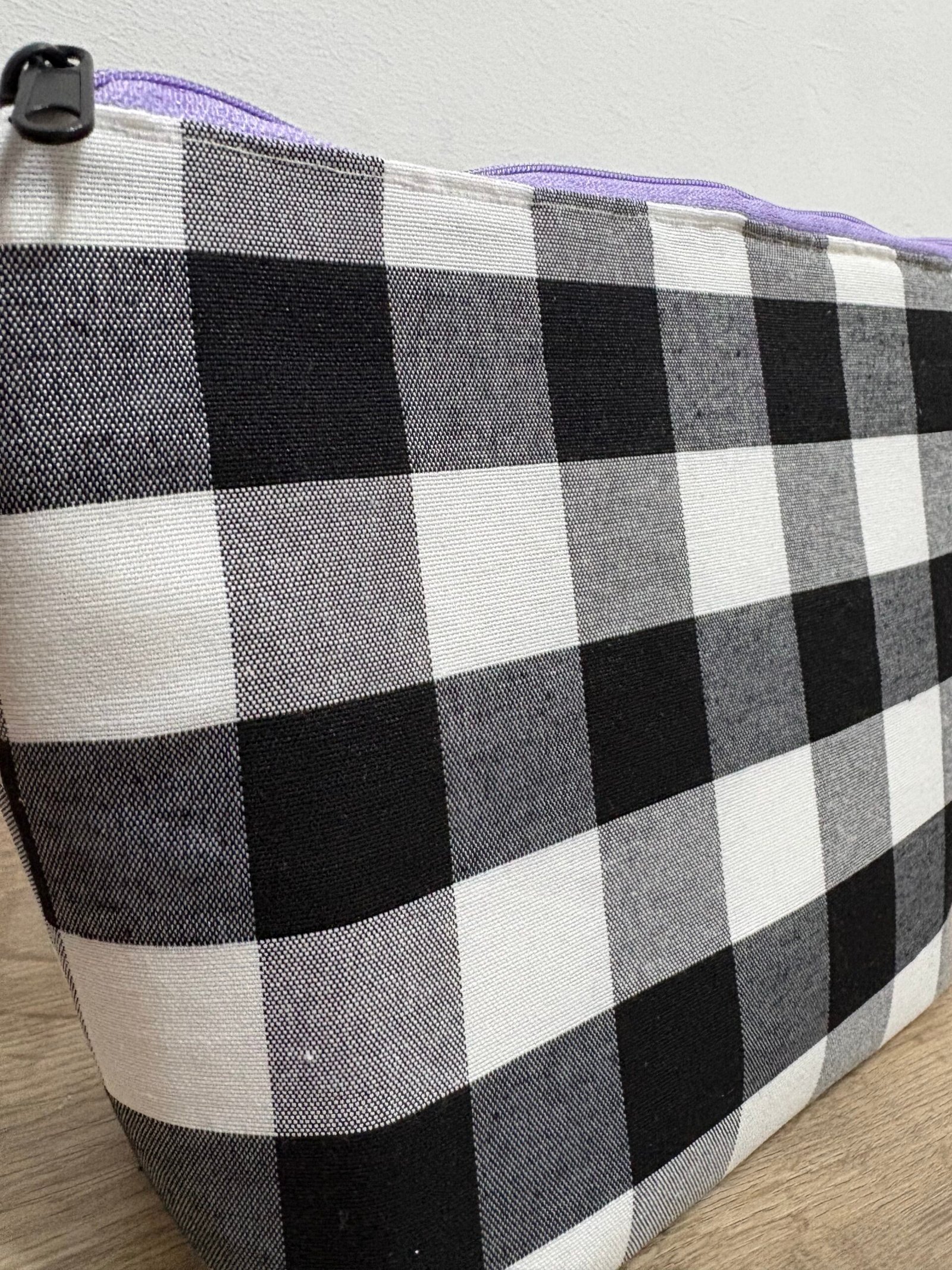 El interior de cada neceser está forrado con una tela negra que no solo complementa el diseño exterior, sino que también ofrece una mayor durabilidad y facilita la limpieza. La verdadera joya de estos neceseres es su vibrante cremallera de color lila. Este detalle no solo añade un toque de color moderno y divertido, creando un contraste llamativo con el patrón vichy, sino que también asegura un cierre suave y seguro, manteniendo tus pertenencias a salvo y organizadas.