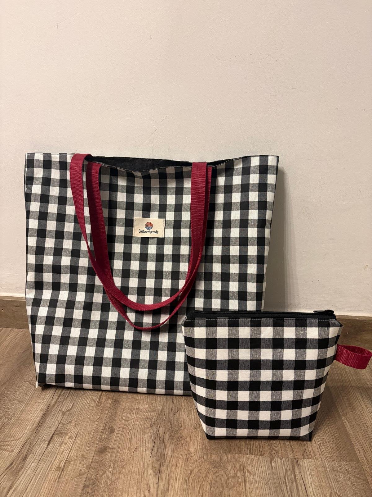 Conjunto de Totebag y Neceser de Cuadros Vichy (Blanco y Negro). Set elegante de tela duradera con forro interior y asas fuertes. El neceser a juego es acolchado para una protección óptima. ¡Perfecto para llevar tus esenciales con estilo!