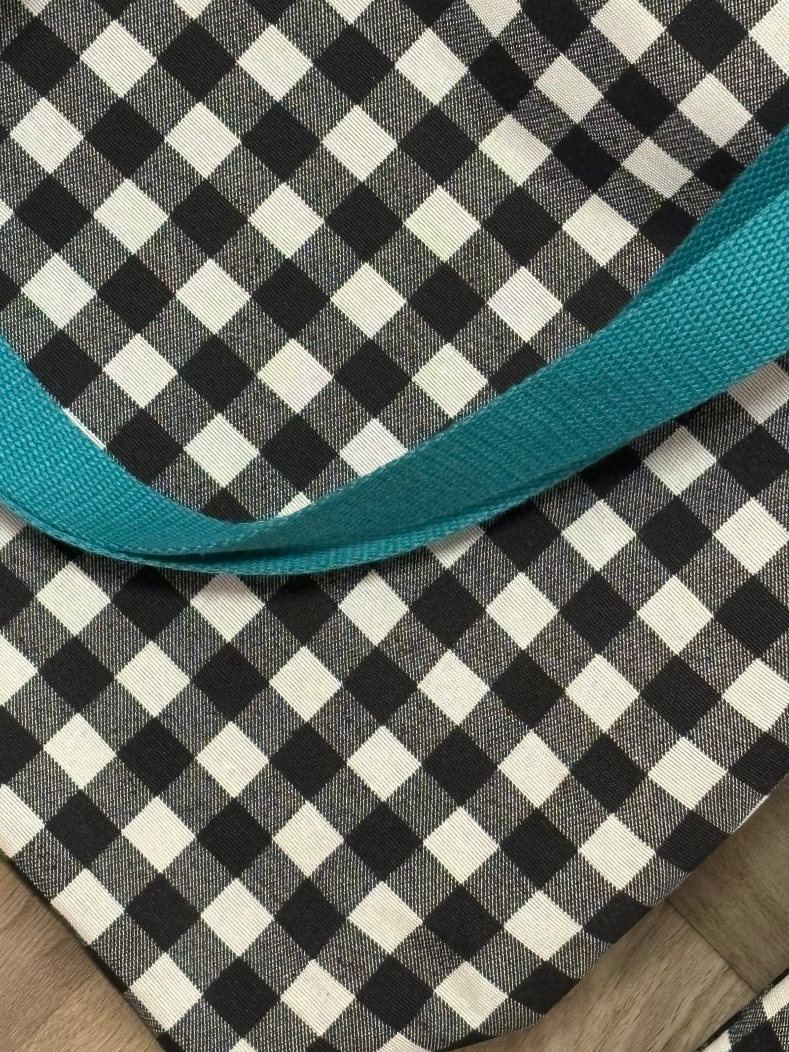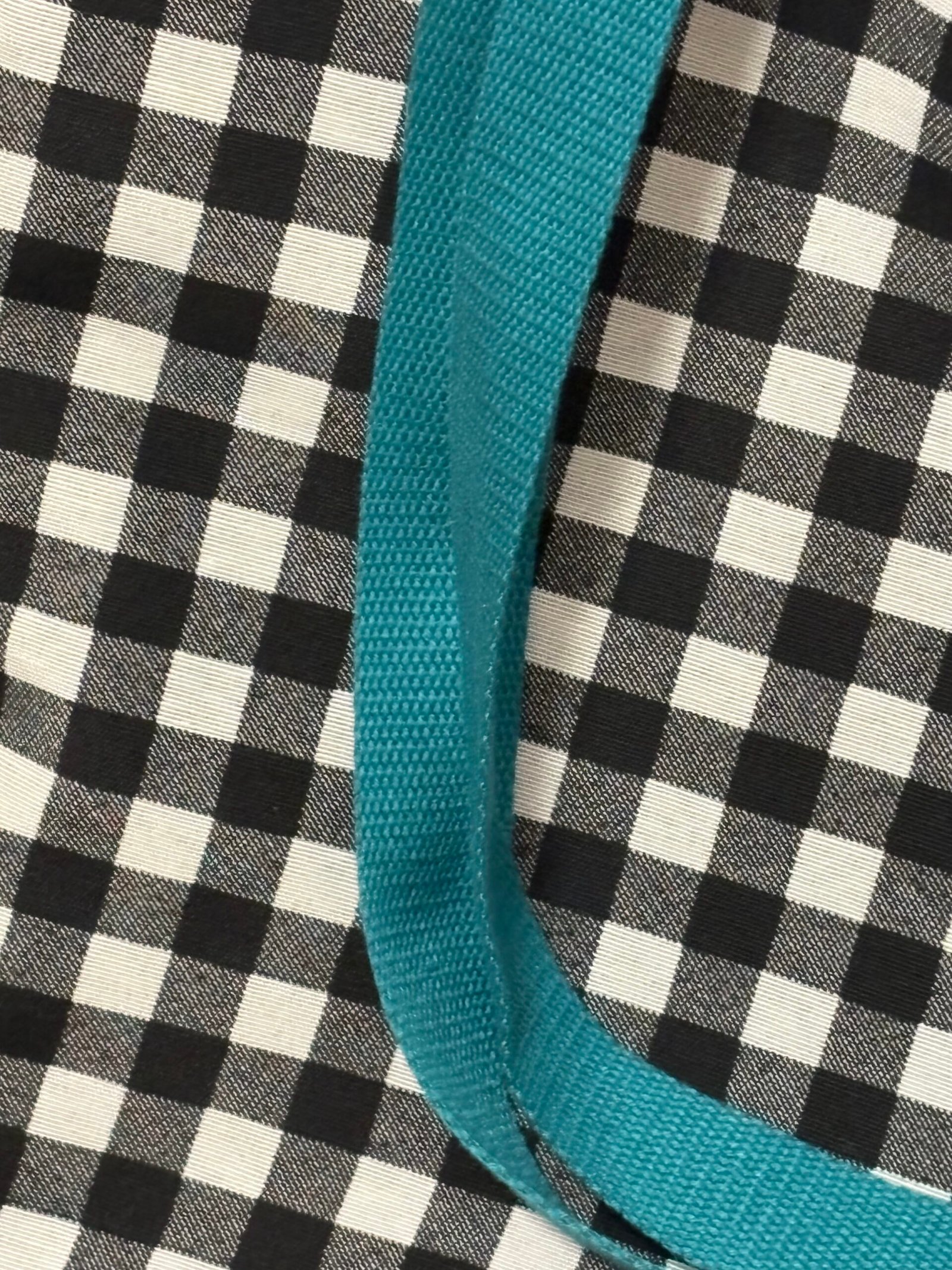 Bolso tote de cuadros vichy en blanco y negro, con un forro liso que complementa su diseño. Sus cómodas asas tipo mochila en un vibrante color turquesa añaden un toque distintivo. Ideal para llevar tus objetos cotidianos con estilo y funcionalidad, realzando tu look diario.